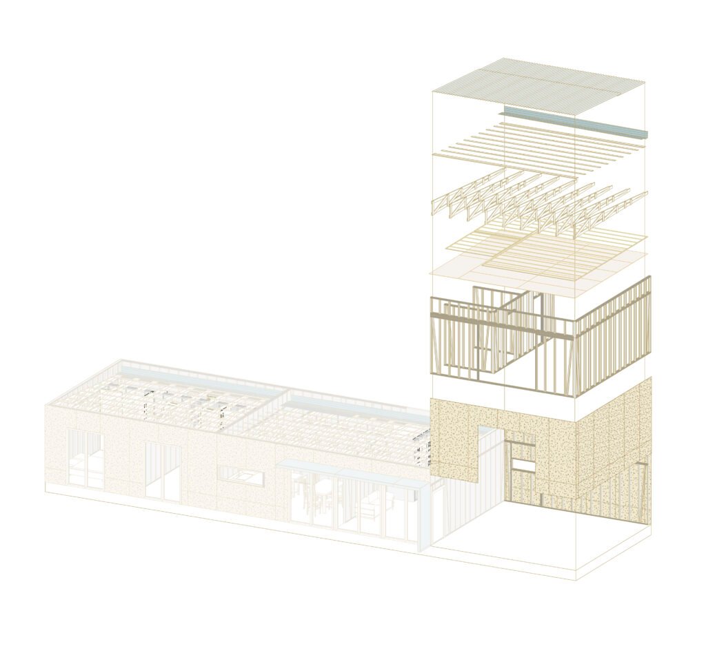 Mediante explotados 3D podemos ver los sistemas constructivos utilizados, desde la plataforma hasta la cubierta. En este caso la imagen nos muestra una vivienda sobre radier, con muros estructurales e interiores de acero galvanizado revestidos en OSB. Una solución muy tradicional a la hora de evaluar la relación precio – calidad de una obra.